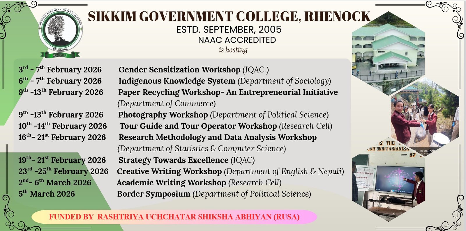 Sikkim Government College, Rhenock is one of the major institutes of learning and education in the eastern hills of Sikkim, India. It was established in the year 2005. Ever since, the College has stood out and tall against every challenges to provide quality education and promote learning in the hills. Being the first institution for higher education in Rhenock it aims at the all-round development of every individual student. It has been more than a decade that the institution has been quenching the intellectual thirst and providing quality education to hundreds of students belonging to a diverse background. Students’ performance every year reflects the quality of education being imparted in the institution, which strives to fulfill the demands of modern times, specific needs of the society and nation at large. Since its inception, Sikkim Government College, Rhenock is committed to the task of encouraging students to think independently, to help them understand the complexities, challenges of today’s life and to prepare them to become dynamic